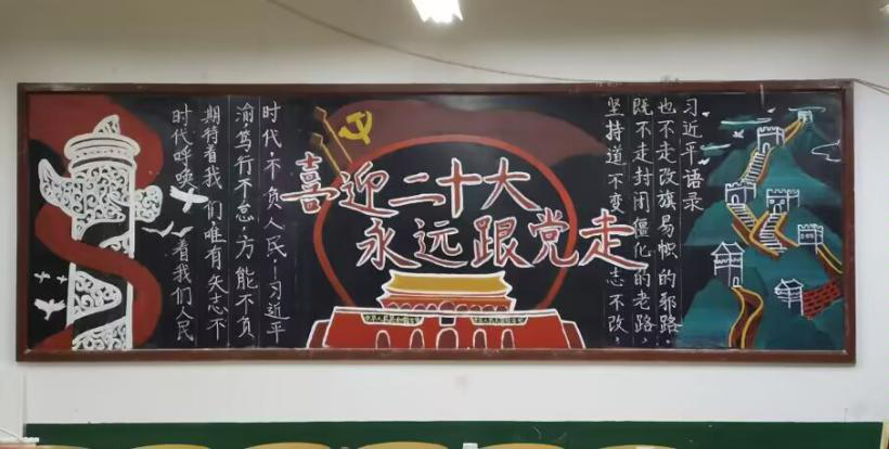 自党的二十大召开以来,足球直播515官网 就本次板报设计活动面向全体学生进行作品征集,各班级踊跃参与、精心绘制。同学们立足实践,把红色基因、精神谱系融入板报作品中,用文字与图画传党情、颂党恩,众多图文并茂、创作新颖的黑板报及手抄报作品脱颖而出。其创作的板报内容不拘于时、内容丰富、版式多样、布局美观,让“方寸之地”更具“无限风景”。同学们精心绘制的板报传达了他们对中国共产党的无限热爱和美好祝福。