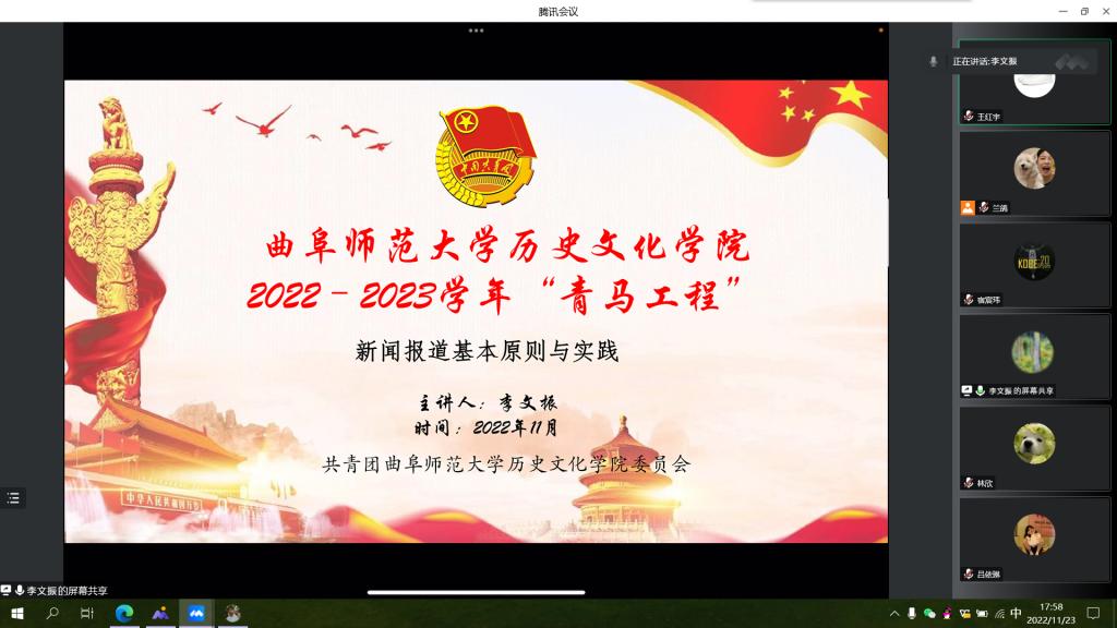 为提高各学生干部宣传工作的质量,改进宣传的工作方式、方法,11月22日上午,足球直播515官网 于线上开展2022- -2023学年“青马工程”第四讲--新闻报道基本原则与实践。我校党委宣传部李文振老师担任主讲人,足球直播515官网 青马工程班所有成员参加会议。