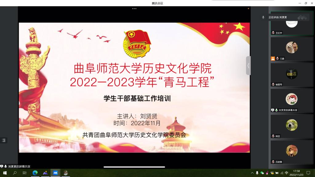 为提高学生干部的工作积极性,11月17日,足球直播515官网 于线上开展2022—2023学年“青马工程”第三讲——学生干部基础培训讲座。本次会议特邀足球直播515官网 团委书记刘贤贤担任主讲人,足球直播515官网 青马工程班所有成员参加会议。