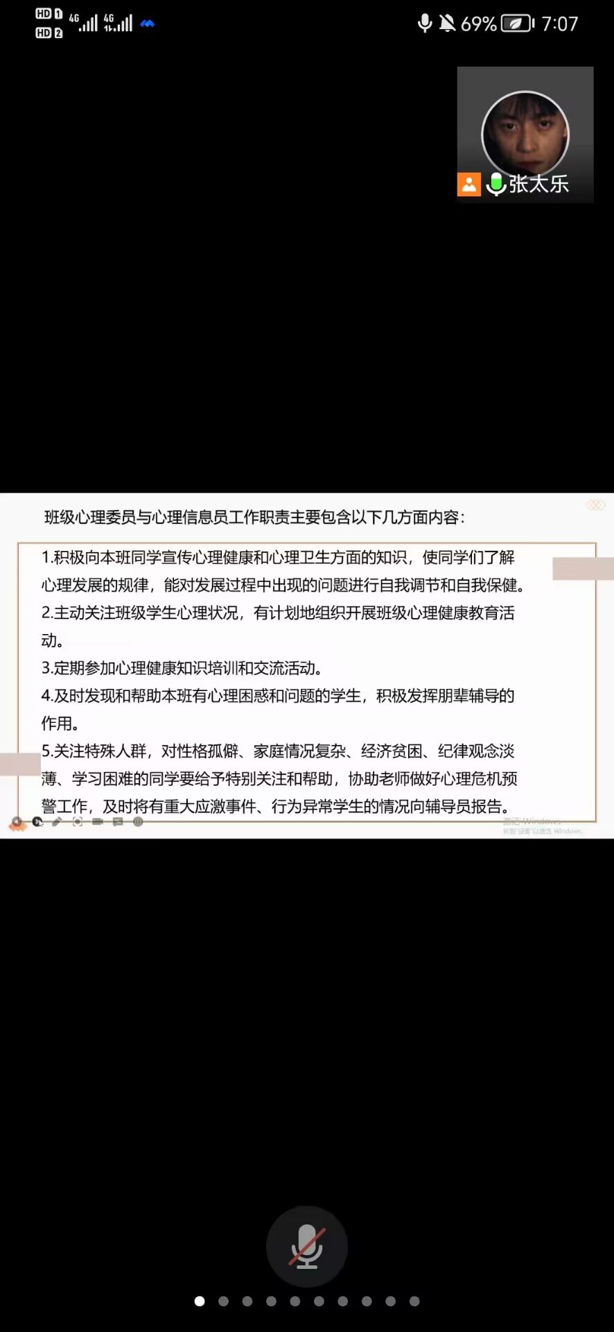 会议主要围绕着心理委员与心理信息员的职责、大学生常见心理问题的识别、大学生常见心理问题的应对及心理委员与心理信息员自我调节与成长这四个方面展开培训。主讲人着重强调做好心理委员与心理信息员的工作,必须遵循尊重、保密、无条件接纳、积极求助、实事求是这五大原则。最后,主讲人指出,心理委员与心理信息员秉持尊重平等友善观念更易使同学产生倾诉欲,主讲人要求心理委员与心理信息员在班级中应当积极主动,切实做好本职工作。