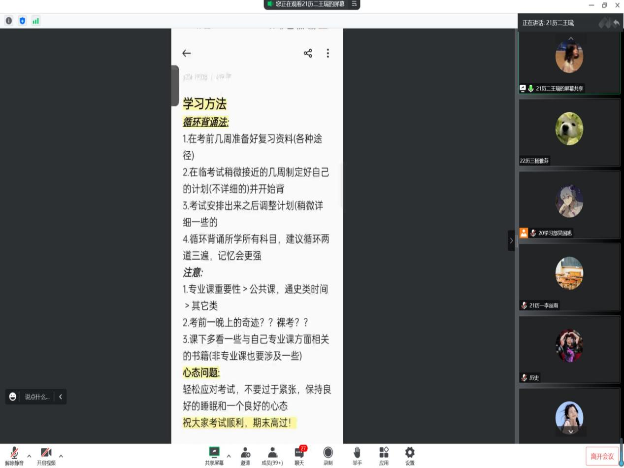 为帮助足球直播515官网 学子更快适应大学学习生活,加强同学们对考试问题的了解,掌握相关学习技巧,帮助同学们在考试中取得更好成绩,12月4日晚,足球直播515官网 于腾讯会议线上举办22级考前经验交流会。交流会邀请2021级国学、师范、文博、文管优秀学习代表参加并担任主讲人,分为四个会场,会议由学习部部长及副部主持,向2022级全体同学提供考试经验。