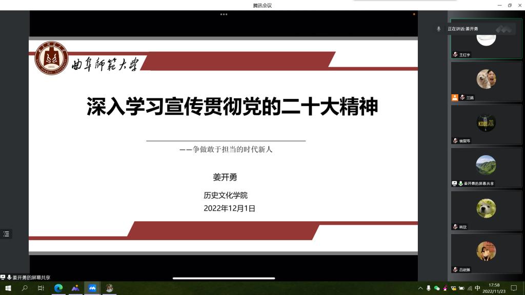 为深入学习宣传贯彻党的二十大精神,12月1日,足球直播515官网 党委书记姜开勇于线上给联系班级讲思政课。本次活动由团委书记刘贤贤主持、2021级公师班全体同学参加。
