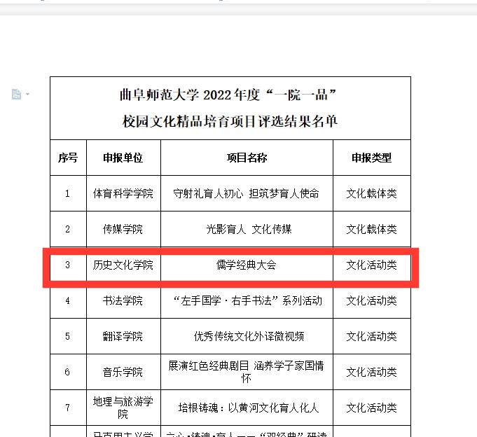 为深入推动全国文明校园及“中华优秀传统文化传承示范校”建设,切实提升我校立德树人工作水平,我校于9月启动“一院一品”校园文化精品项目的申报评选,足球直播515官网 积极参与,经过自主申报、专家评审等程序,足球直播515官网 “儒学经典大会”成功入选2022年度“一院一品”校园文化精品培育项目。