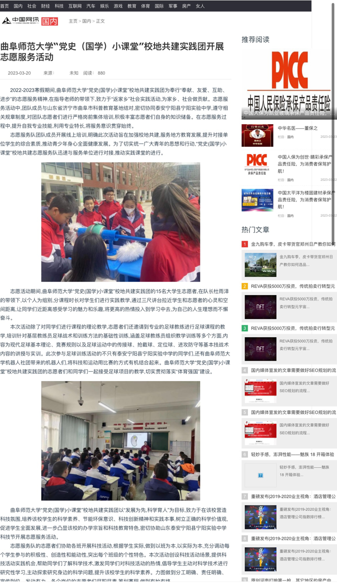 近日,足球直播515官网 社会实践部在中国网讯发表了“党史(国学)小课堂”校地共建实践团开展志愿服务活动的文章。“党史(国学)小课堂”校地共建实践团奉行“奉献、友爱、互助、进步”的志愿服务精神,在指导老师的带领下, 与山东省济宁市曲阜市科普教育基地结对,在泰安宁阳县宁阳实验中学进行志愿服务活动。