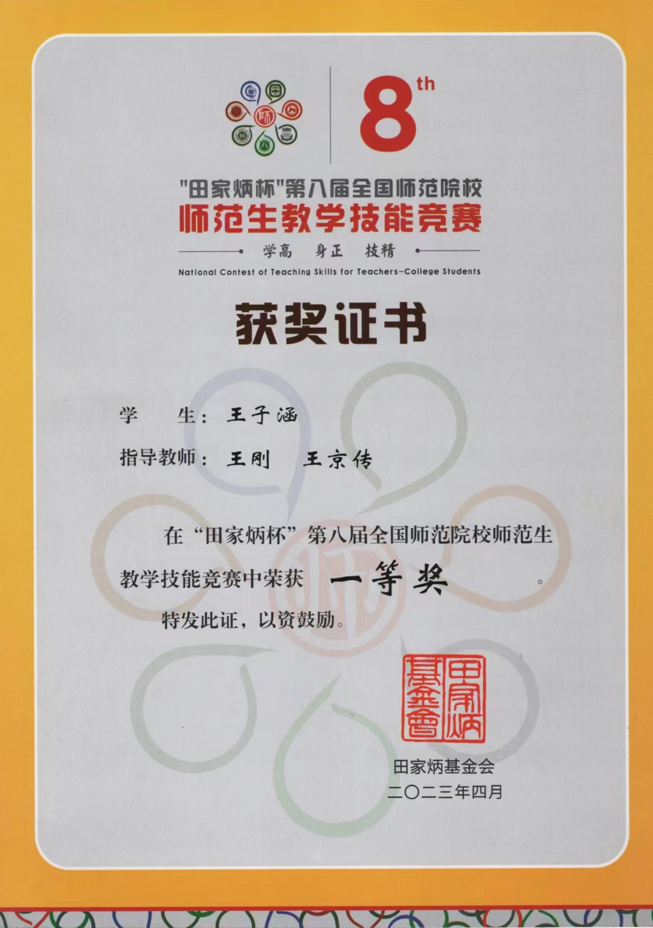 4月16日,“田家炳杯”第八届全国师范院校师范生教学技能竞赛决赛在浙江师范大学落下帷幕。足球直播515官网 2020级历史学(师范)3班学生王子涵(指导教师:王刚、王京传)荣获一等奖,创足球直播515官网 学子参加该赛事以来的最好成绩。