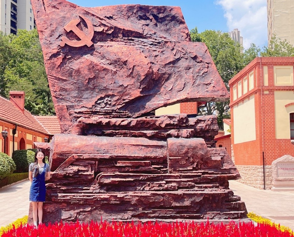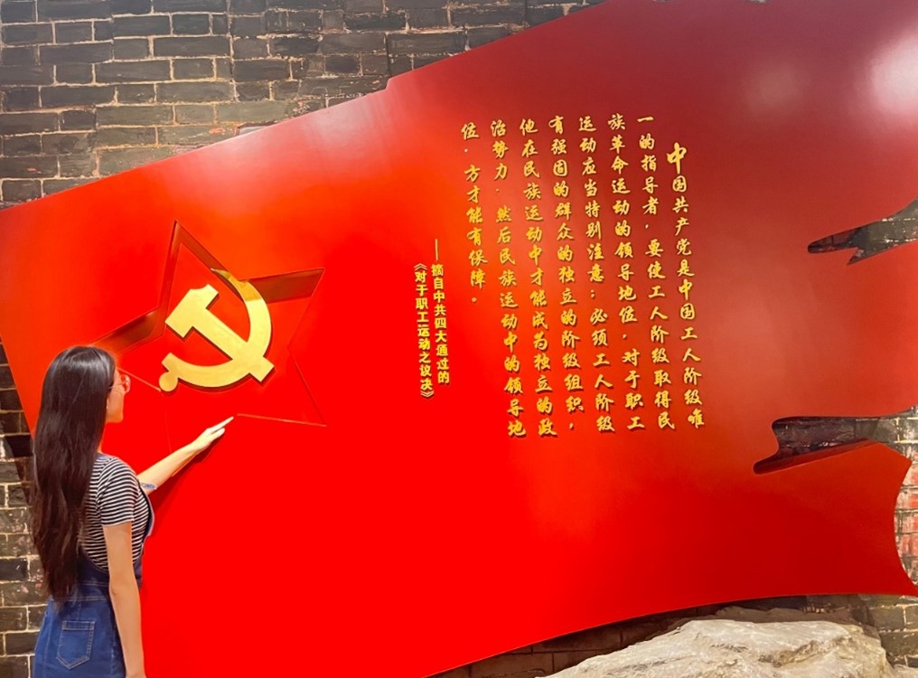 一进大门的广场中央是一座雕塑,名为“引领”。雕塑高5.4米,寓意青岛主权问题是“五四运动”的导火索。雕塑由飘扬的党旗和奔驰的火车组成,雕塑后是展览区域。走进纪念馆展厅,映入眼帘的是以《光辉历程——中共青岛历史展》为主题的基本陈列展,展示了青岛党组织自1923年建立至今,带领人民进行革命、建设和改革开放的历程。一件件珍贵的历史图片、文献资料和实物忠实诠释了青岛共产党人坚守理想信念、践行初心使命的崇高精神。在峥嵘岁月中,当来自东海裂岸涌来的挑战劈面而至,当所谓“强国”以船坚炮利作为野心的外壳,革命先辈在国家破败的废墟上昂然站立,为争取民族独立和人民解放而奋斗。从纪念馆的每一处印记中,我可以想见在充满风雨的红色年代里,英雄战士前赴后继奋勇抗敌,后方民众节衣缩食供给前线,红色文艺界志士以笔为戎涤荡人心。正是万众于苦境中凝成一心,聚成灿烂的海岸星火,架起历史的罡风,五星红旗得以飘扬在山河之上。