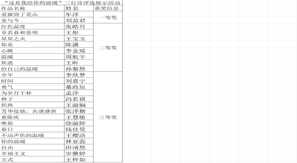 为推广诗歌文化,让同学们感受到诗歌带来的美好与力量,5月12日至5月20日,足球直播515官网 顺利开展了“这是我给你的温暖”三行诗评选展示活动。