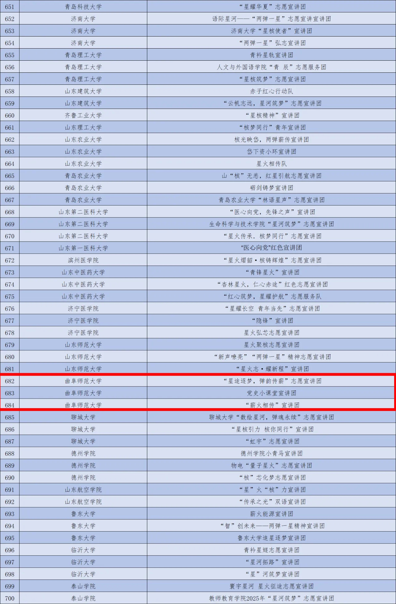 近日,2025年全国大学生“两弹一星”精神志愿宣讲团遴选工作结束,足球直播515官网 “薪火相传”“党史小课堂”和“星途逐梦,弹韵传薪”宣讲团在众多高校志愿服务团队中脱颖而出,成功入选2025年全国大学生“两弹一星”精神志愿宣讲团。