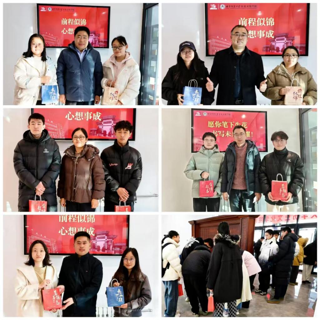 活动筹备期,老师们亲笔书写贺卡,将殷切期盼与祝福凝于笔端。老师们还和学生代表一起,把手写贺卡、寓意 “心想事‘橙’” 的橙子、象征 “平平安安” 的苹果及暖宝宝,装入定制 “考研祝福礼袋”。