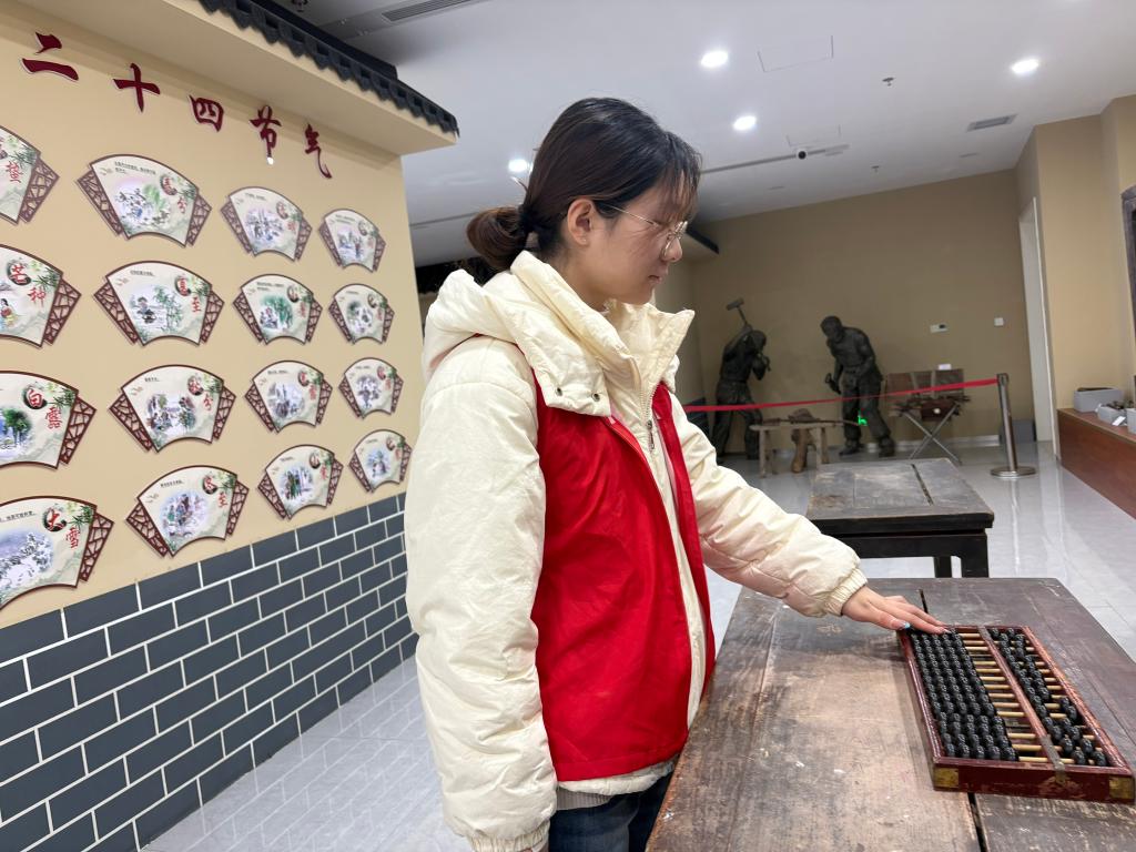 在商河县博物馆的文物库房,实践队员们在专业老师的指导下,开启了与历史的深度对话。一张斑驳的老木桌前,队员正凝神端详一把古朴的算盘,指尖轻轻抚过温润的算珠,感受着岁月沉淀的肌理与温度;旁边的队员则手持资料册,对照着一件清代瓷碗,仔细辨认纹饰特征,梳理其烧制工艺与历史用途,试图还原这件老物件在旧时生活中的使用场景。