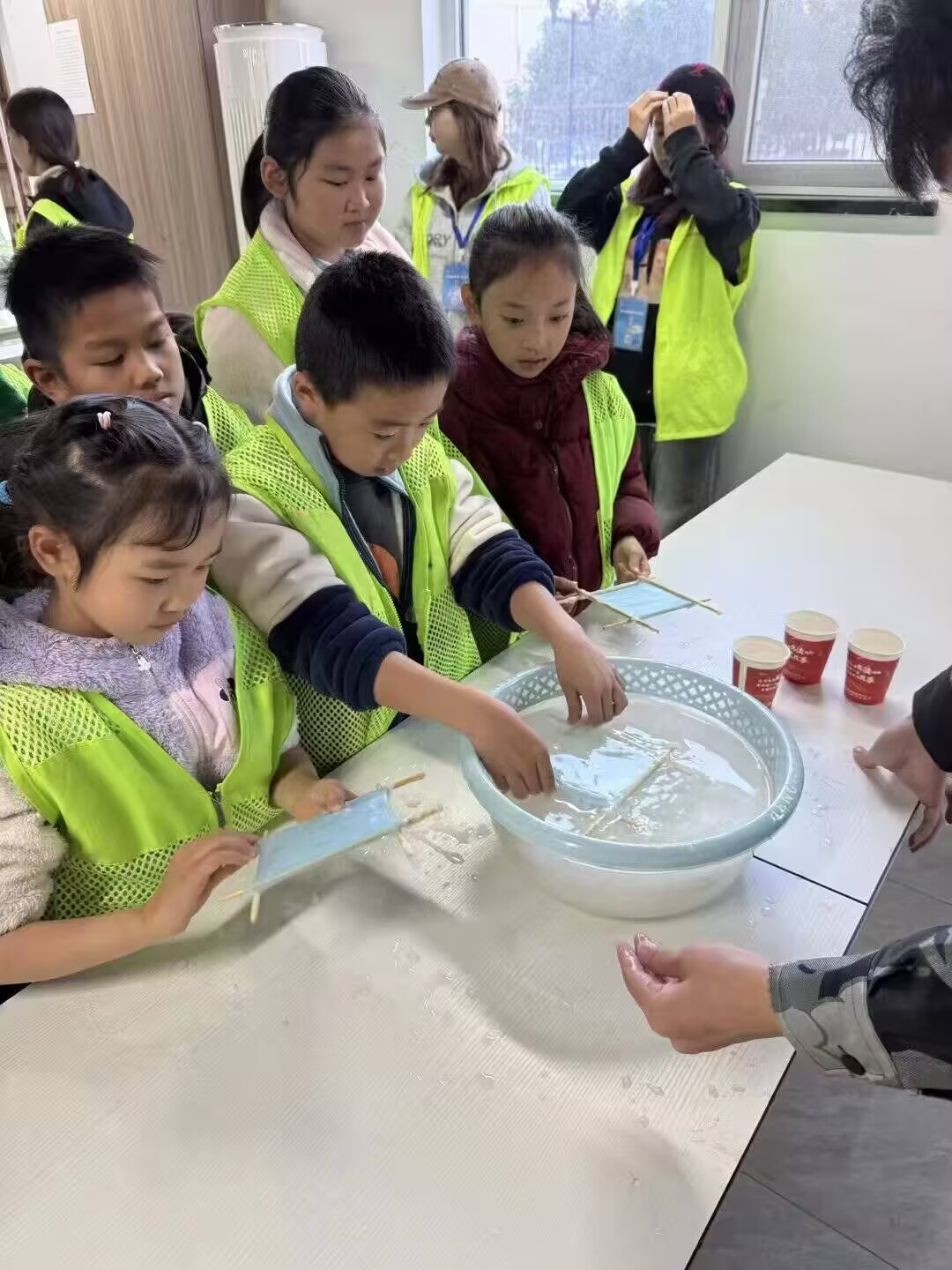 动手实践环节,实践队员全程陪伴指导,确保每个孩子都能深度参与。在木质模型拼装环节,队员们巡回观察,提醒孩子注意零件的拼接角度与结构稳定性,遇到零件卡滞的情况时,会示范如何借助工具调整接口,同时鼓励孩子相互协作,共同解决拼装难题。在手工造纸环节,队员们先演示纸浆的搅拌与铺浆技巧,再协助孩子将纸浆均匀铺在滤网之上,过程中不断提醒孩子控制力度,避免纸浆厚薄不均。当看到自己制作的纸张逐渐成型时,孩子们纷纷露出欣喜的表情,队员们则抓住契机,向他们讲解古代造纸术的发展历程,让科普知识与人文体验深度融合。