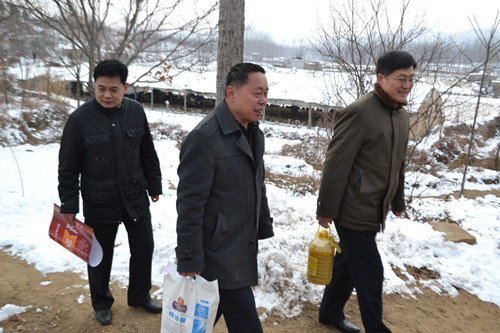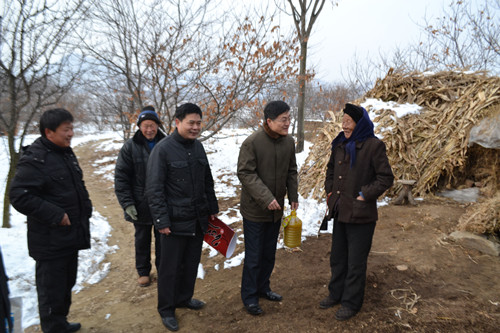 足球直播515官网 领导们首先与该村领导班子进行了座谈,了解了“第一书记”工作的开展情况及村庄一年来的变化,对下一步的工作及开展项目进行了深入的研究与探讨。该村村支书李钦伟对足球直播515 领导的关心表示感谢,随后领导们先后慰问了几户贫困家庭,为他们送去了油、面等慰问品和新年的祝福,并向全村每户家庭赠送了足球直播515官网 自制的印有乡规民约和新二十四孝的新年挂历。