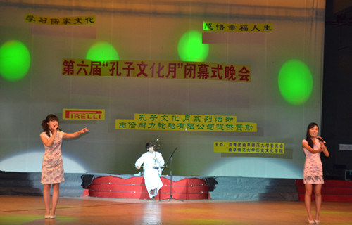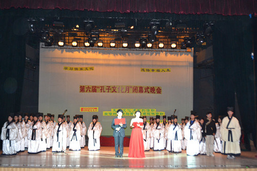 晚会首先回顾了本届“孔子文化月”举办的一系列活动,缅怀圣贤、追寻儒宗的祭祀大典,国内外知名儒学专家的满载学术气息的讲座,富有传统文化色彩的国学知识竞赛、儒服射礼、成人礼等活动生动展现了孔子文化月“学习儒家文化,感悟幸福人生”的活动主题。在随后的文艺表演中,节目形式多样,内容丰富,诵读短剧、歌曲、舞蹈、话剧、武术等各类表演异彩纷呈。古典舞《楚腰》气质高雅,舞姿飘逸优美。话剧表演《鸿门宴》重温历史,再现楚汉争霸,将本次活动推向高潮。汉服礼仪展演《汉韵华裳,道德齐礼》表现出“着我汉家衣裳,兴我礼仪之邦”的文化气韵。晚会还公布了第六届“孔子文化月”系列活动的获奖名单及“优秀孔子文化使者”名单。