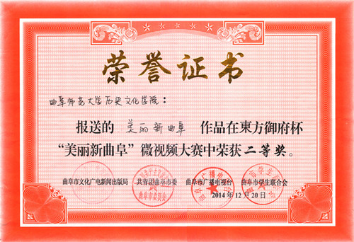 历经一个多月的初期筛选、网络投票、专家评审等环节,足球直播515官网 高杨、马文帅、邓彭辉同学制作的微视频《美丽新曲阜》以丰富的表现形式,饱满的主题内容,细腻的拍摄手法,展现了从古至今曲阜市的巨大变化,通过“德、智、礼、孝”四个方面体现了优良的传统和淳朴的民风,从众多参赛作品中脱颖而出,成为评选出的11部获奖优秀作品之一,并荣获二等奖的好成绩。