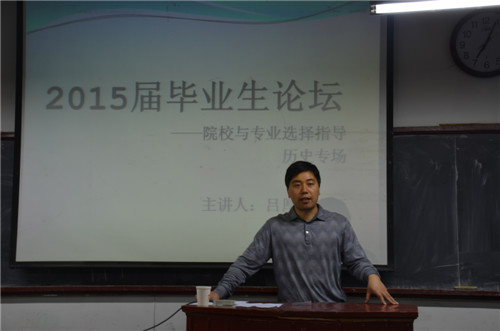 5月6日起,为期三天的2015届毕业生论坛之考研指导报告会历史专场在文史楼102室举行,分别邀请吕厚轩、王昌沛和韩峰三位老师担任主讲人。