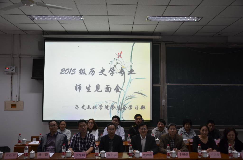 10月12日晚,足球直播515官网 2015级历史学专业师生见面会在综合楼506室举行。足球直播515官网 院长成积春,教授李先明、王曰美,副教授韩锋、王昌沛等老师出席此次见面会,见面会由团总支书记王建阳主持。