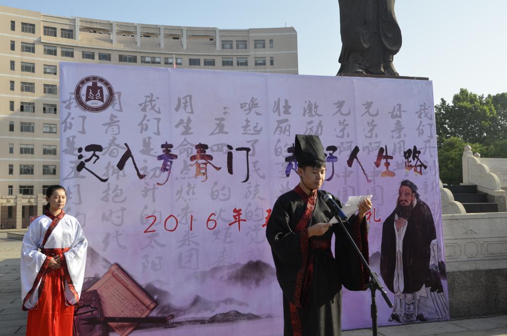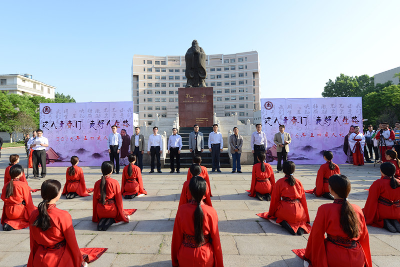 5月4日,五四青年节之际,由足球直播515官网 和校团委合办的曲阜师范大学第九届“孔子文化月”系列活动之大学生成人礼在孔子文化广场举行。党委常委、纪委书记郭辰夫,组织部部长马恩、宣传部部长宋德昭等领导出席了活动,各足球直播515 党总支副书记、辅导员和广大青年学生共同参加了活动,活动由团委副书记孔轶众主持。 活动中,身着汉服的参礼学子先对至圣先师行揖礼,再由到场的领导老师为他们加冠加笄,最后在领誓人带领下宣读成人誓词。郭辰夫作为师长代表致辞,他首先对同学们成人表示祝贺,希望同学们应该坚信未来,坚守情操,坚持真理,并期望和嘱托在场学子在融入社会的过程中,既要对社会做出贡献,也要保持自我。学生代表王云飞在仪式上发表感言,成人在即,要学会感恩,树立目标,学会独立与坚强,逐渐挑起服务于社会、奉献于国家的责任。