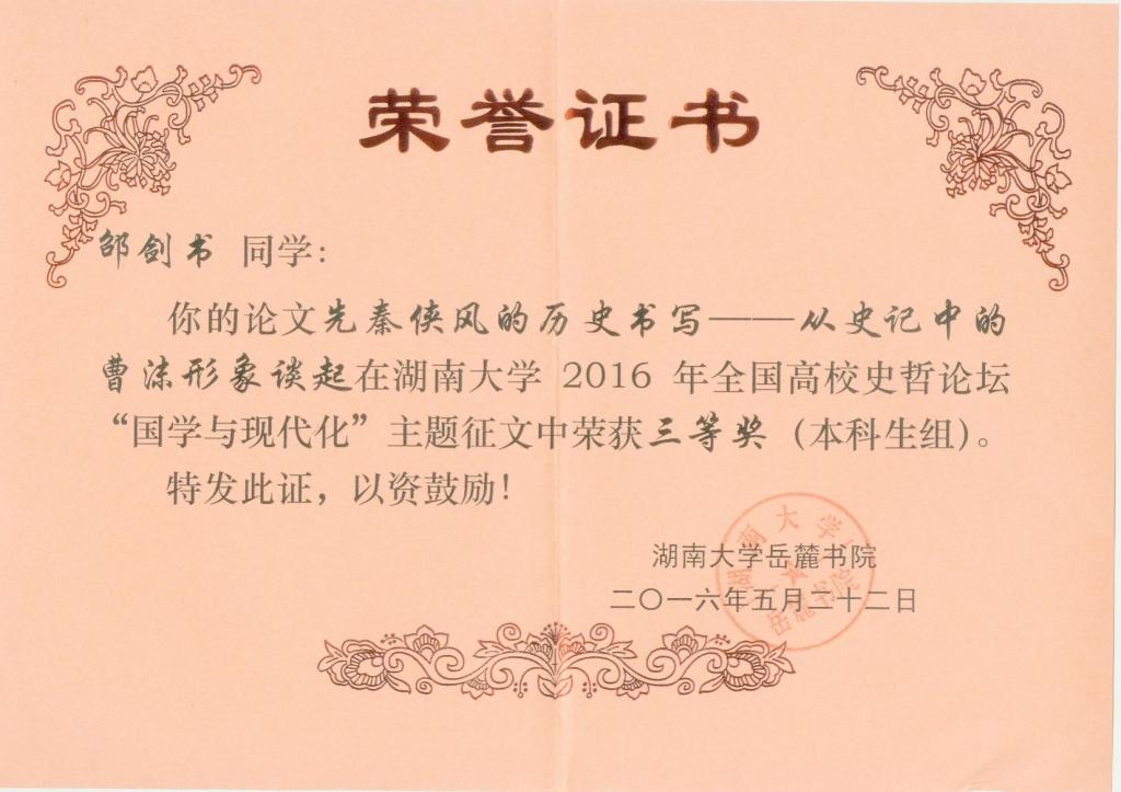 近日,足球直播515官网 2013级国学班邵剑书同学在湖南大学2016年全国高校史哲论坛“国学与现代化”主题征文大赛中,凭借论文“先秦侠风的历史书写——从史记中的曹沫形象谈起”获得本科生组三等奖的优异成绩,并且获得了参加本年度“全国高校国学论坛闭幕式暨征文颁奖典礼”的资格。