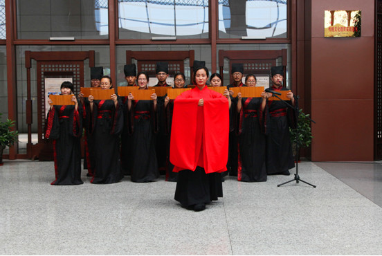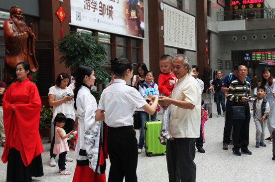 6月8日上午,端午佳节之际,京沪高铁曲阜东站候车大厅内,足球直播515官网 传统礼仪展演队身着儒服吟诵《离骚》、表演汉舞“礼仪之邦”、演绎汉礼,与候车旅客进行《论语》接龙互动,为旅客献上了多道端午节文化大餐。中国青年网、新华网、人民网、大众日报、山东广播电视台、中国山东网等十几家媒体记者对活动进行了报道。 本次展演在传统佳节之际让更多人了解中华传统文化,弘扬儒家精神。