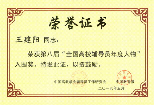 王建阳老师于去年11月获得山东省高校工委授予的“山东省十佳辅导员”称号,并被推荐为全国第八届辅导员年度人物候选人,最终荣获入围奖。他所负责的班级多次获得“全国先进班集体”、“山东省优秀班集体”、“曲阜师范大学十先班集体”称号;他个人也多次获得山东省十佳辅导员(我校首位)、山东省大学生暑期社会实践优秀指导教师、挑战杯优秀指导教师、大学生科技文化艺术节优秀指导教师、宿舍评估先进个人;济宁市第二届大学生科技节优秀指导教师、“学党史 学国史”活动优秀辅导员;曲阜师范大学学团工作先进个人、优秀青年工作者、十佳辅导员等荣誉。