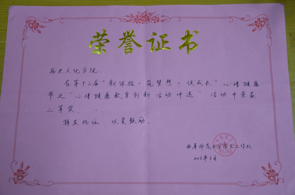 5月29日,曲阜师范大学第十三届“新体验·筑梦想·促成长”心理健康节之“心理健康教育创新评选”活动结束,足球直播515官网 在此活动中荣获二等奖。