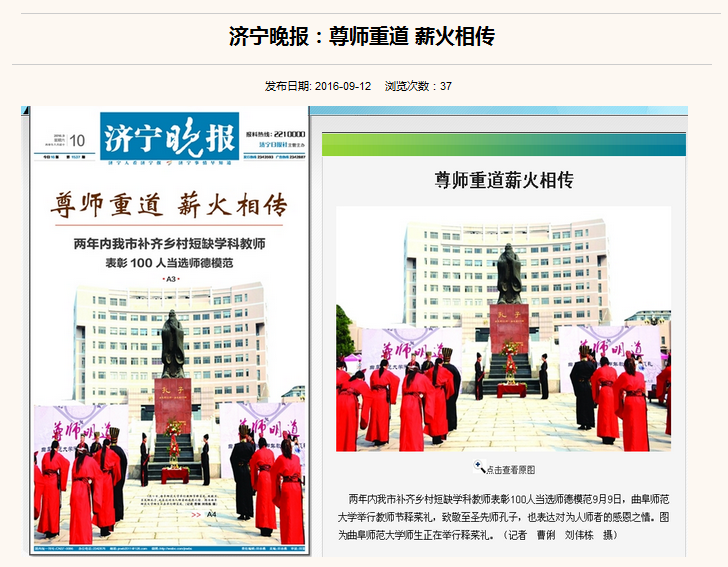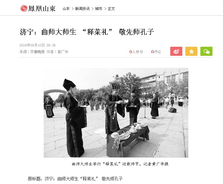 近日,足球直播515官网 承办的教师节“释菜礼”活动引起了媒体的广泛关注。齐鲁晚报、大众日报、山东省教育电视台、济宁新闻联播、凤凰网和济宁晚报等多家媒体对足球直播515官网 举办的“释菜礼”活动的情况进行了相关报道并给予了高度评价。