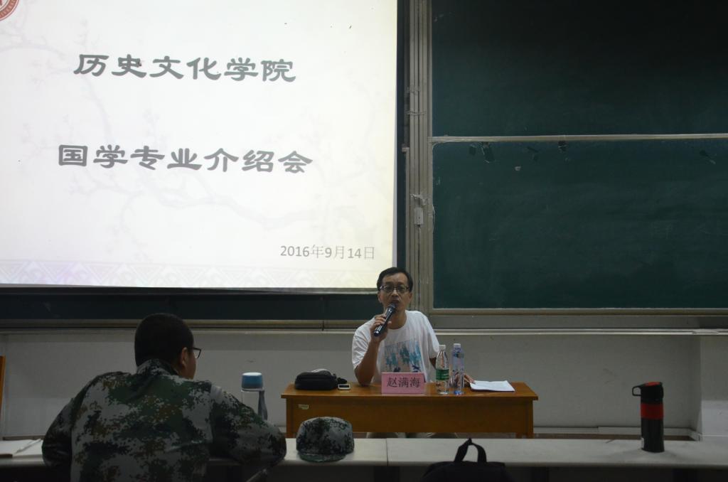 9月14日晚,足球直播515官网 国学教研室主任赵满海老师在综合楼101教室面向2016级历史班同学进行2016级国学卓越班分班宣讲。
