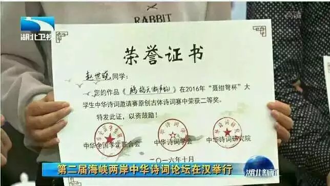 据悉,该比赛由全国学生联合会、中华诗词学会、中华诗词研究院主办,由央视四台海峡两岸节目进行报道。此次活动吸引了来自全国127所高校参赛选手参赛,赵世晓同学与来自北京师范大学、华中师范大学、台湾淡江大学、香港大学、澳门大学等大学的十一位选手同时进入决赛并获得优异成绩。