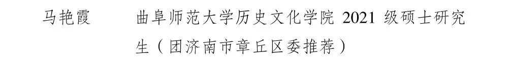 马艳霞曾获山东省优秀毕业生、曲阜师范大学“优秀学生干部”、“优秀团干部”、校级学业一等奖学金等荣誉。从本科阶段起,马艳霞同学就积极参与志愿服务工作。她连续三次报名“青鸟计划”,参与“返家乡”实习实践活动,利用寒暑假分别在章丘区教育和体育局和共青团章丘区委进行志愿服务,担任“返家乡实习实践大学生临时团总支”书记,负责“返家乡”实践大学生与共青团章丘区委的联络与沟通工作,同时参与青春章丘公众号新闻的撰写工作,以自身行动激励更多青年学子积极参与家乡建设。志愿服务期间,马艳霞还积极运用历史学的专业知识,参与党史宣传工作,为庆祝建党百年贡献自己的青春力量。