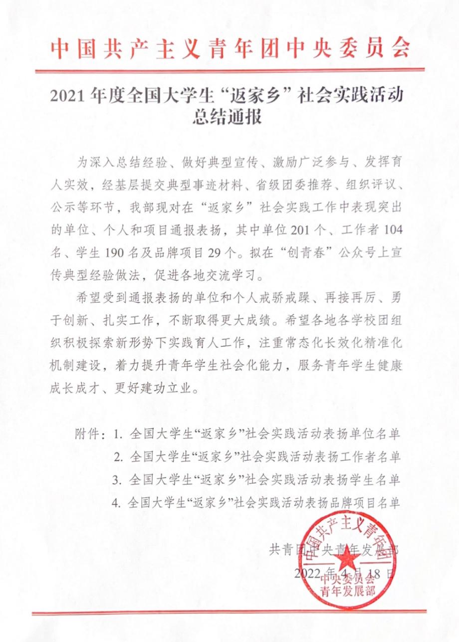 近日,共青团中央印发《2021年度全国大学生“返家乡”社会实践活动总结通报》,足球直播515官网 2021级硕士研究生马艳霞荣获2021年度全国大学生“返家乡”社会实践活动通报表扬。