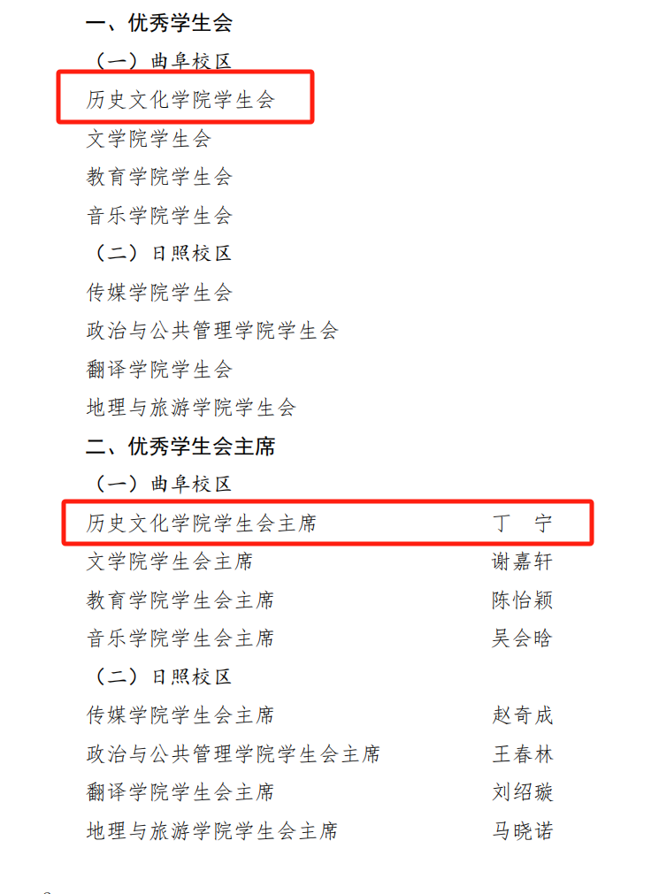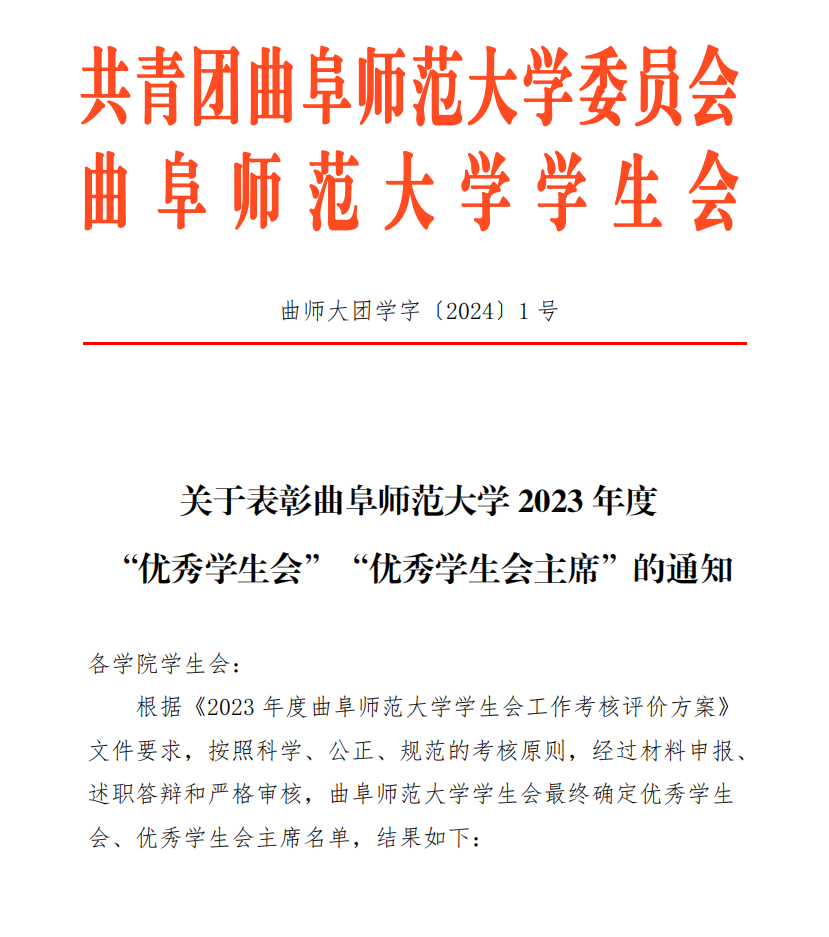 根据《2023年度曲阜师范大学学生会工作考核评价方案》文件要求,按照科学、公正、规范的考核原则,经过材料申报、述职答辩和严格审核,将足球直播515官网 学生会评选为“优秀学生会”,获得曲阜师范大学2023年度足球直播515 学生会第一名。学生会主席丁宁获得“优秀学生会主席”荣誉称号。