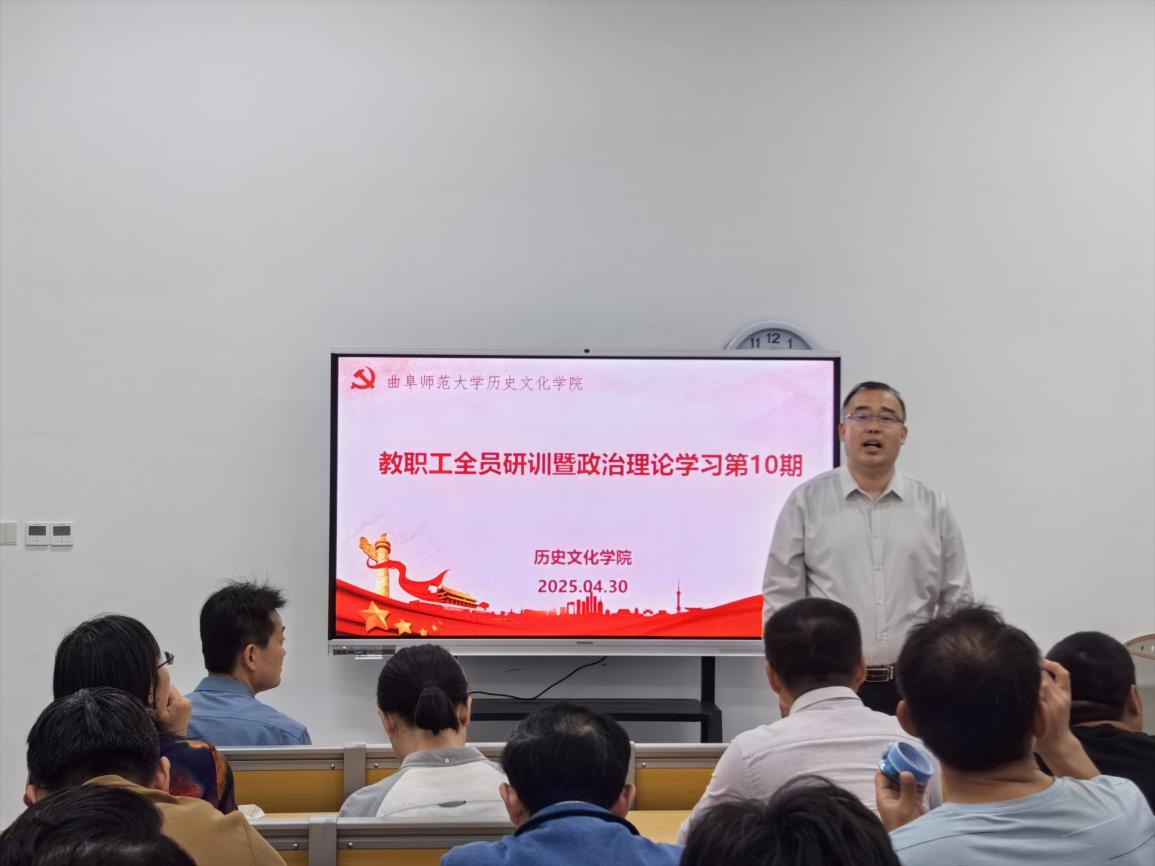 2025年4月30日下午,足球直播515官网 在孔子书院B120教室开展教职工全员研训暨政治理论学习第10期。活动由足球直播515 党委副书记王建阳主持,足球直播515 党委学习委员孙锋领学,在校教师50余人参加研训。