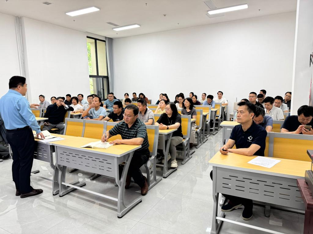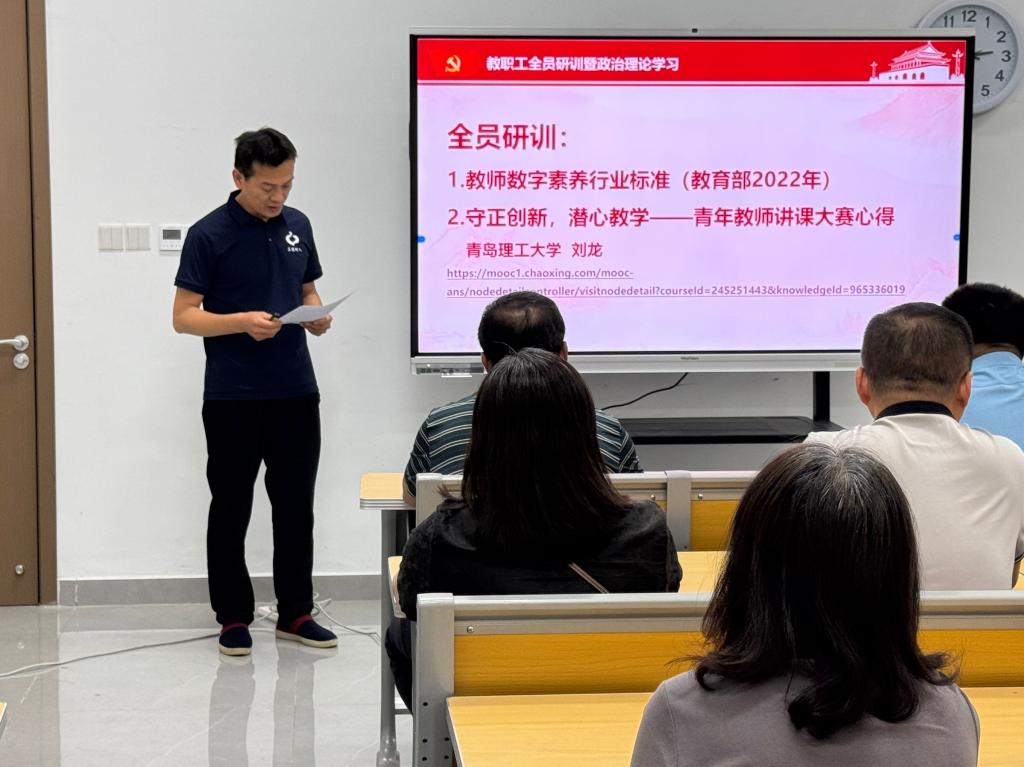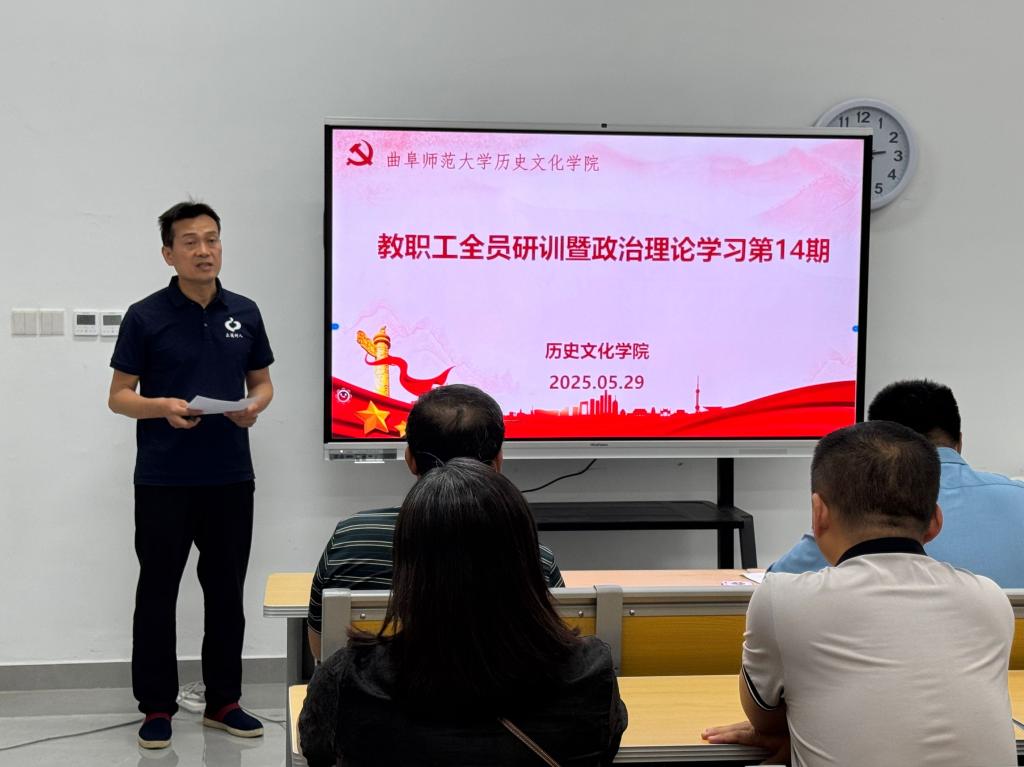 2025年5月29日下午,足球直播515官网 在孔子书院B120教室举行教职工全员研训暨政治理论学习第14期活动。活动由足球直播515 副院长王京传主持,足球直播515 党委学习委员孙锋领学,在校教师近60人参加研训。