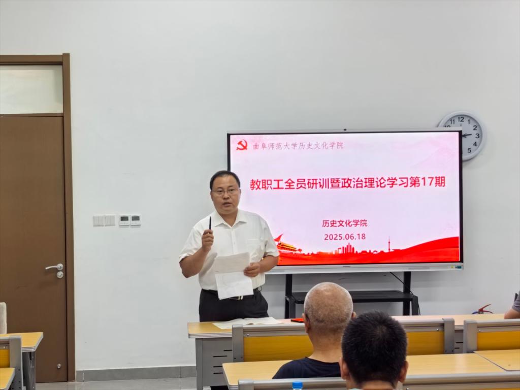 2025年6月18日下午,足球直播515官网 在孔子书院B120教室举行教职工全员研训暨政治理论学习第17期活动。活动由足球直播515 党委书记姜开勇主持,足球直播515 党委学习委员孙锋领学,在校教师近60人参加研训。