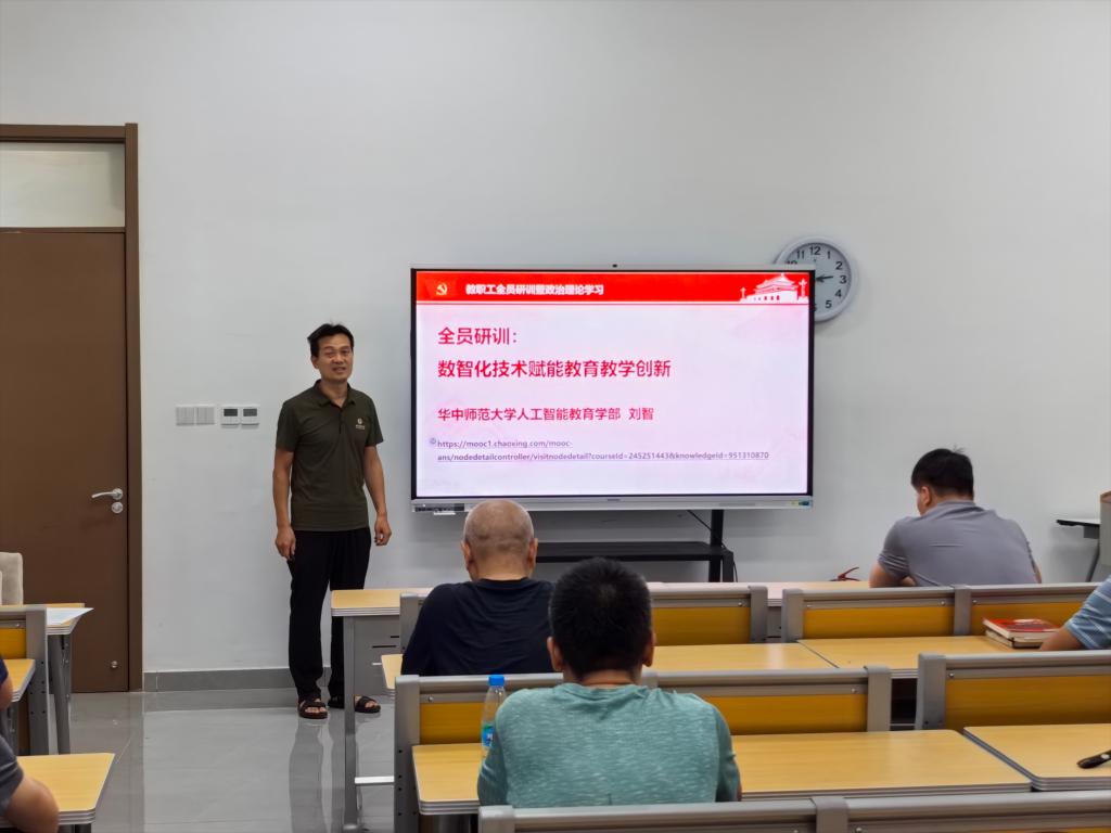 政治理论学习之后,全体教职工集中观看了华中师范大学人工智能教育学部刘智教授主讲的《数智化技术赋能教育教学创新》报告视频。刘教授指出,人工智能为教育带来新的生命力,人工智能与教育发展同频共振,未来教学场景、教学内容和教育模式变革势不可挡。刘教授通过分析话语表征工具、多层次状态模型等人工智能在教育领域的应用实践,阐释了新的时代、新的社会,必将孕育未来教育新生态。