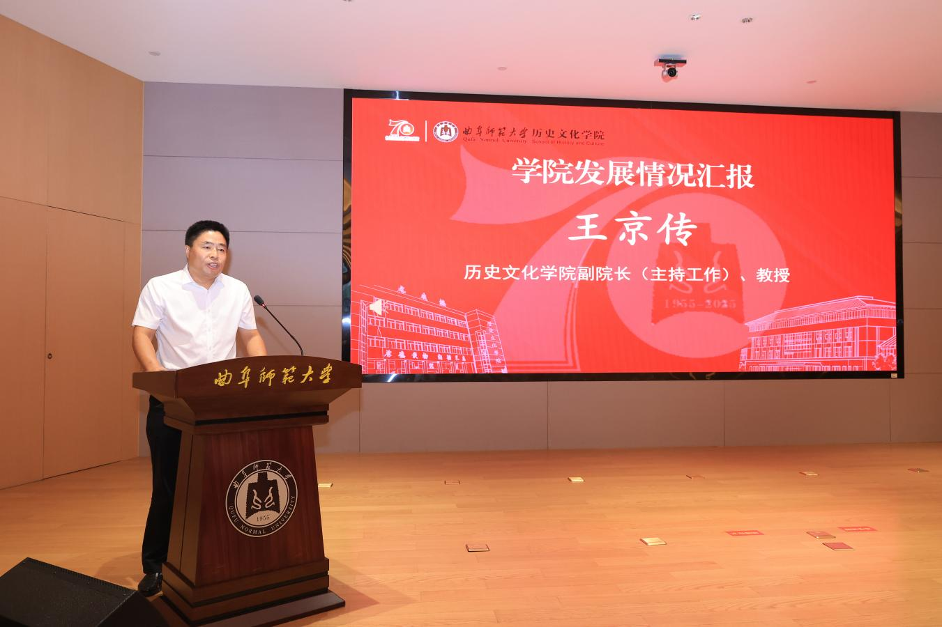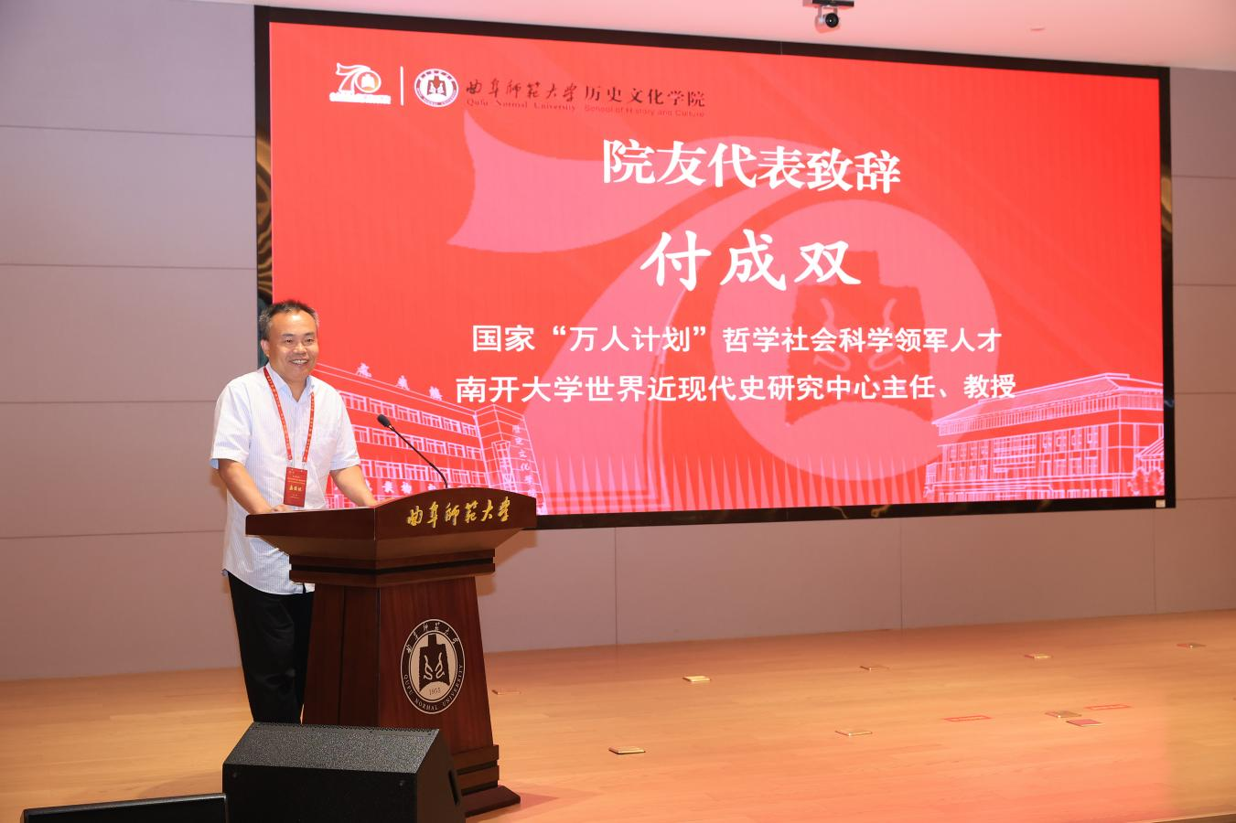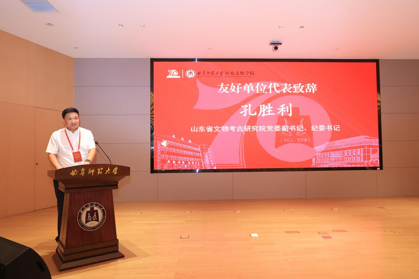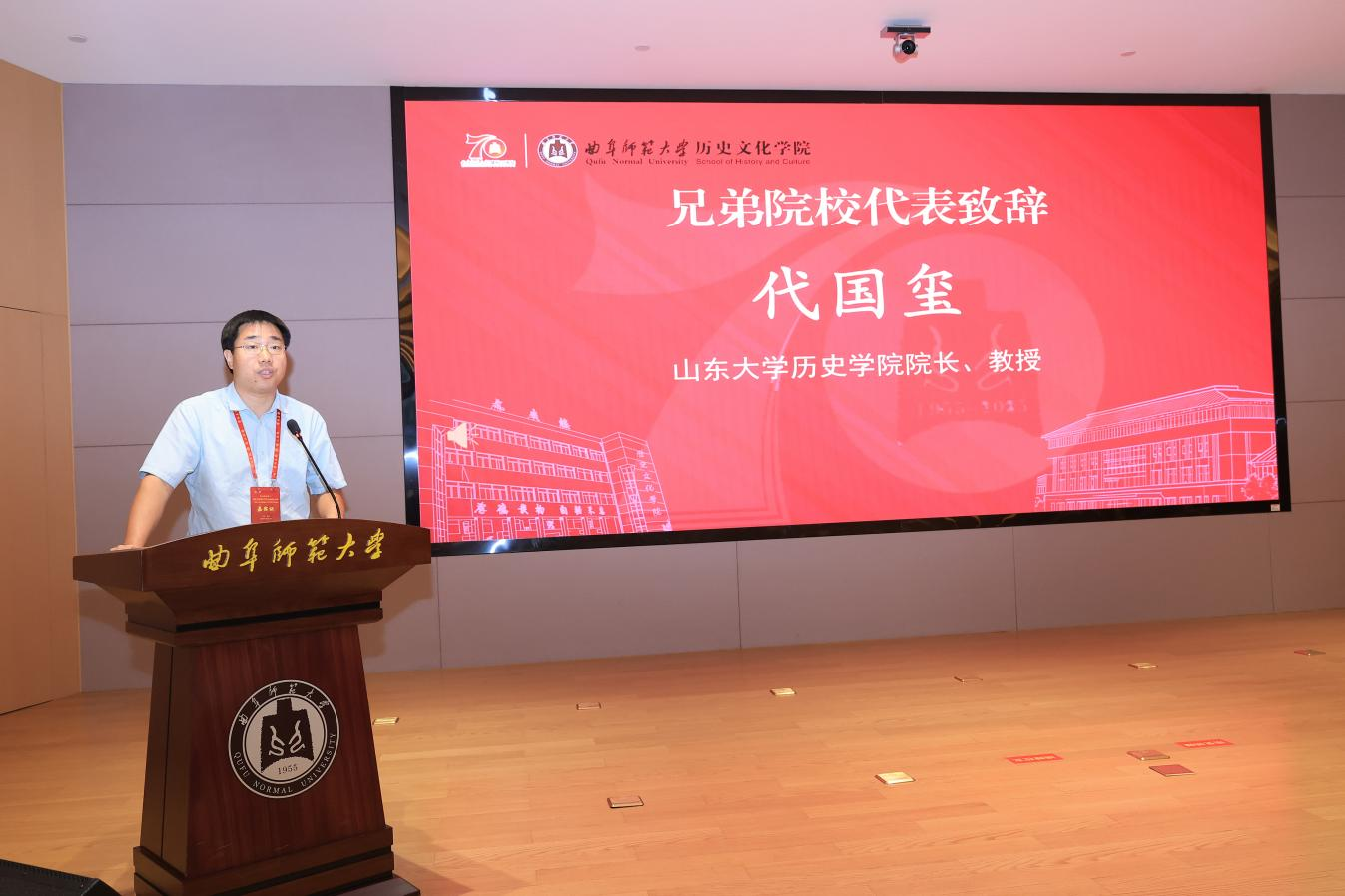 山东大学历史足球直播515 院长代国玺代表兄弟院校致辞,肯定了曲阜师大足球直播515官网 七十年来在人才培养、学术研究上的突出成就,尤其在中国史、儒学与孔府档案研究、世界史领域成果显著,已成为全国重要的史学基地与儒学重镇。