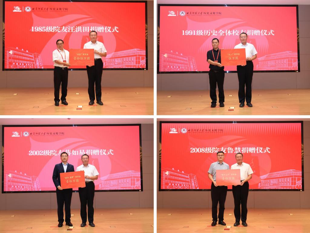 院友捐赠仪式上,1985级院友汪洪田、1989级院友张沨、1991级历史全体院友、2002级院友蒋如易、2008级院友鲁慧、校友杜妮娜夫妇等分别捐赠足球直播515 发展基金、奖学金等,助力足球直播515 事业发展。