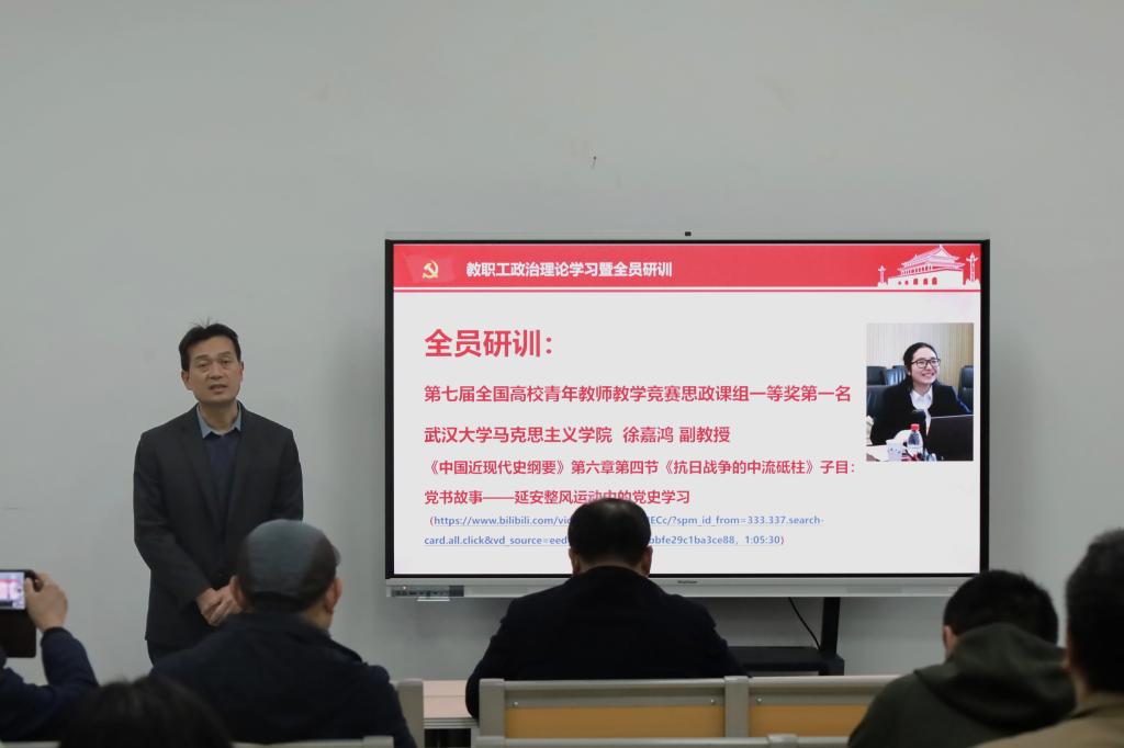 全员研训环节,全体教师集体观看了第七届全国高校青年教师教学竞赛思政课组一等奖第一名、武汉大学马克思主义足球直播515 徐嘉鸿副教授的参赛视频:《中国近现代史纲要》第6章第4讲子目《党书故事——延安整风运动中的党史学习》。视频展示了参赛教师扎实的理论功底、生动的教学设计和自然的课程思政融入,为足球直播515官网 教师优化课堂教学、提升育人实效提供了宝贵借鉴。
