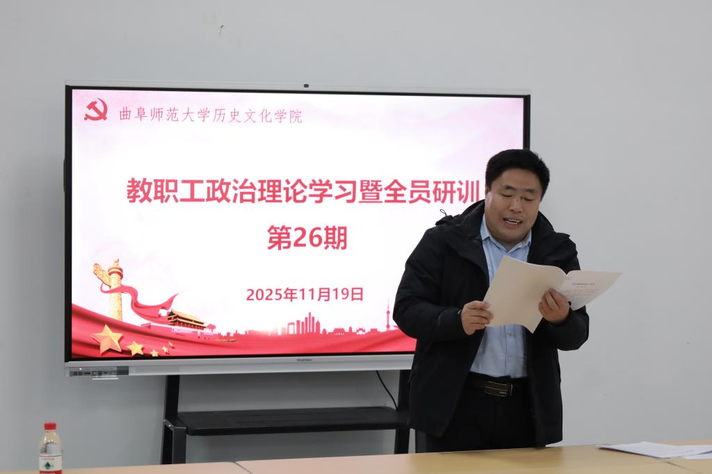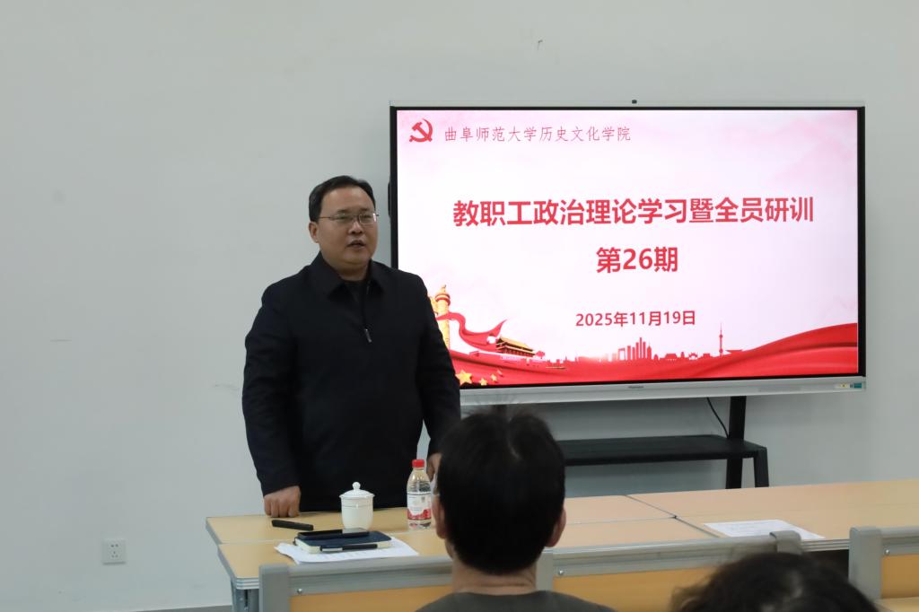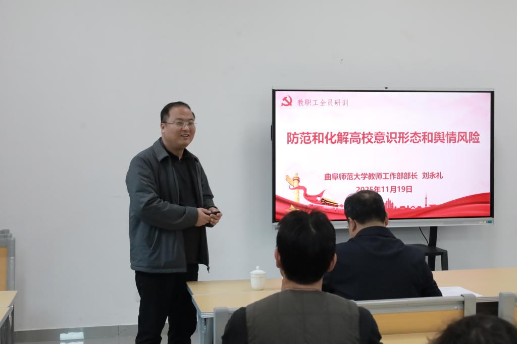 2025年11月19日下午,足球直播515官网 在孔子书院B106教室举行教职工政治理论学习暨全员研训第26期活动。活动由党委书记姜开勇主持,学校教师工作部部长、宣传部副部长刘永礼出席活动并作了题为“防范和化解高校意识形态和舆情风险”的专题报告。足球直播515 在校教师60余人参加活动。