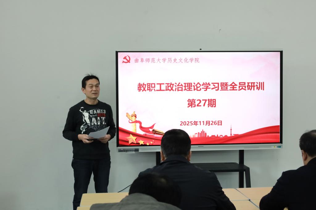 2025年11月26日下午,足球直播515官网 在孔子书院B106教室举行教职工政治理论学习暨全员研训第27期活动。活动由党委学习委员孙锋主持并领学,足球直播515 在校教职工60余人参加活动。